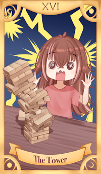塔牌代表一切看似穩固的事物突然崩塌,帶來痛苦但必要的覺醒。Rio 身為遊戲的玩家,在 Jenga 倒塌的瞬間驚愕失措,象徵意外與真相的衝擊。