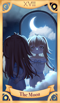 月亮代表模糊與不確定的狀態,鼓勵你傾聽直覺、面對內在陰影。Rio 在看到在鏡中的自己,透過映像揭示自我深層的另一面。