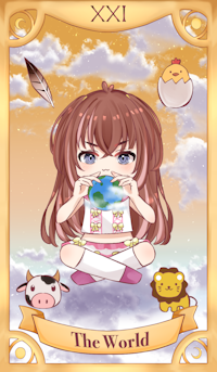 世界代表一段旅程的圓滿結束與靈性整合,是大塔羅的終章,也是新週期的起點。Rio 手捧地球,盤坐於雲端,象徵她與世界的和諧共振。