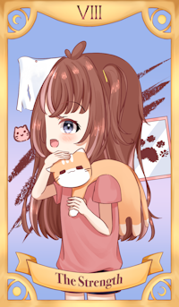 力量牌不只是外在的強硬,而是内在的穩定與情感的馴服。Rio 在此牌中化身為柔性力量的象徵,暗示「力量不一定是武力」的理念。